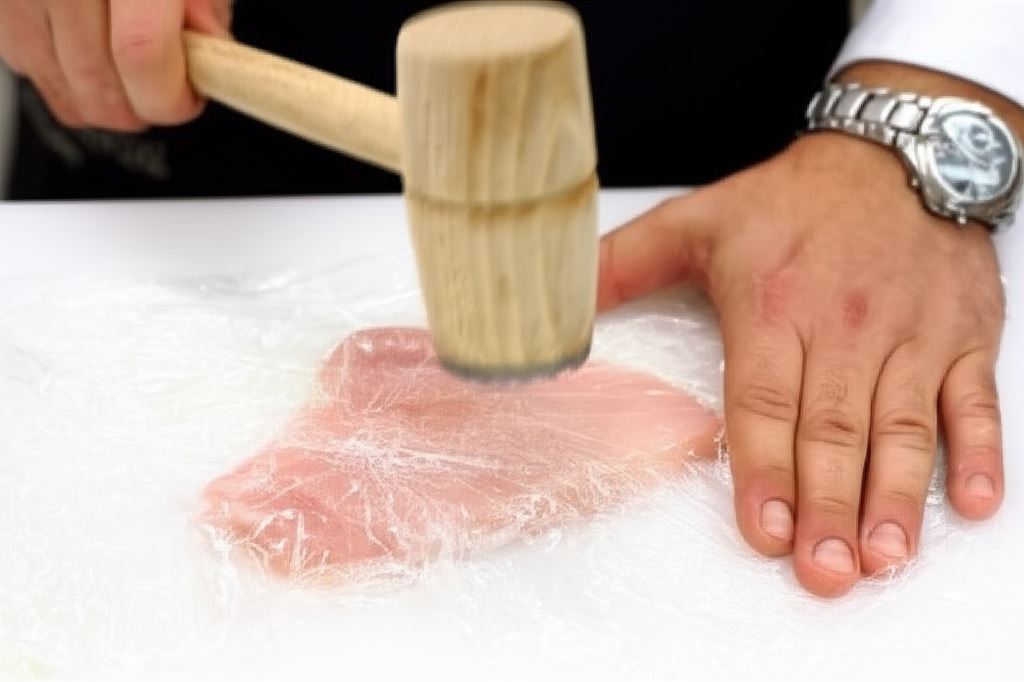 Filety z kurczaka opłucz, usuń błony, tłuszcz i delikatnie ubij tłuczkiem do grubości około 2 cm.