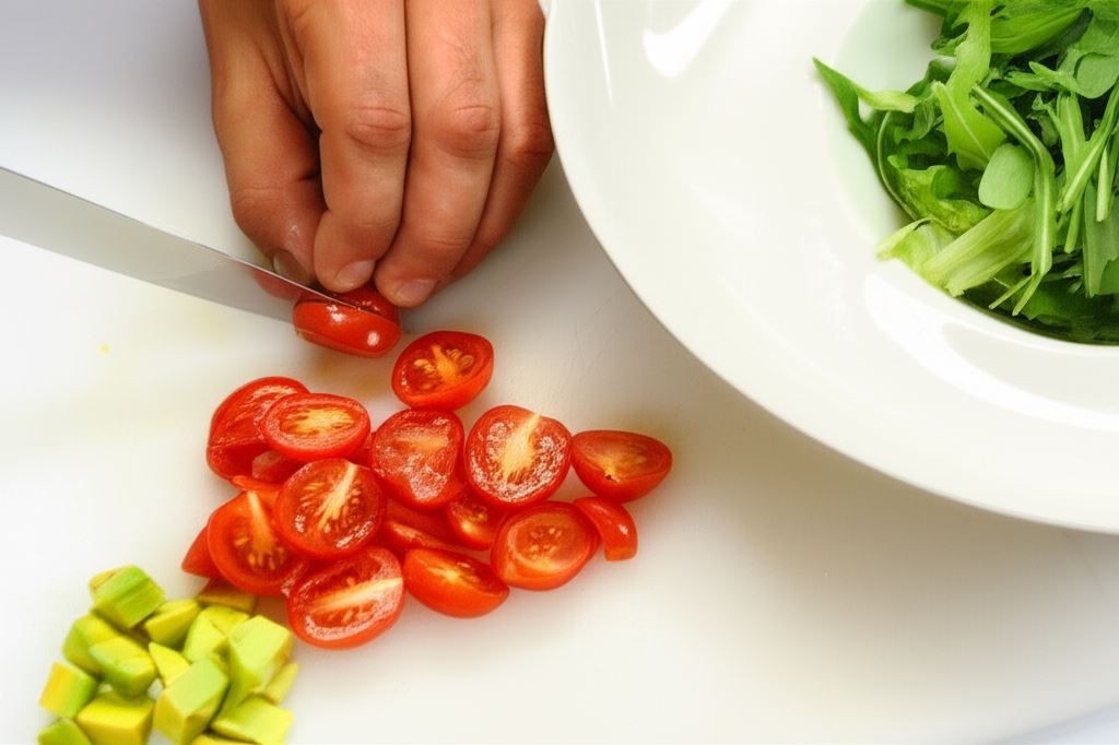 W międzyczasie przekrój wzdłuż opłukane pomidorki, dorzuć pokrojony na cienkie plasterki kozi ser i pocięte w kostkę awokado.