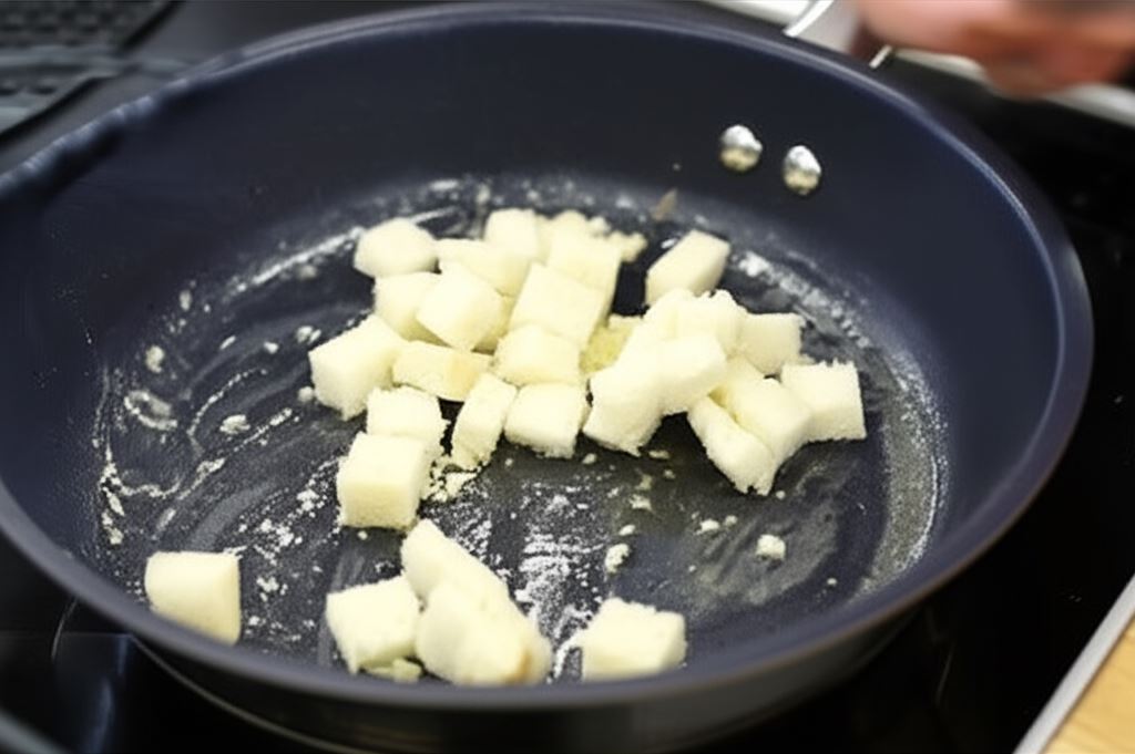 Chleb pozbaw skórki, pokrój w kostkę i przyrumień na oleju na gorącej patelni z niewielką ilością czosnku.