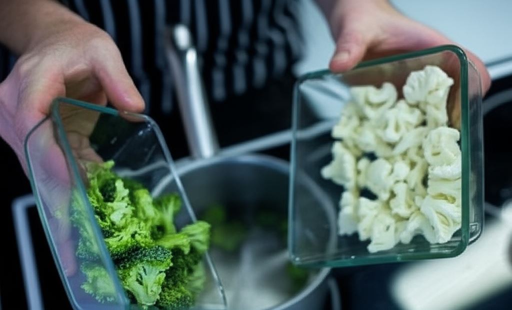 Wytnij małe różyczki z brokuła i kalafiora, potem ugotuj je w osolonej wodzie. Ostudź.
