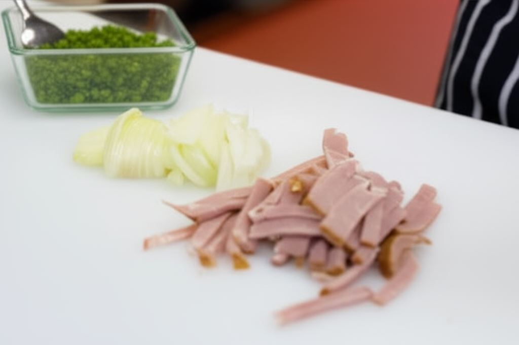 Szynkę, ser oraz cebulę potnij w cienkie paski. Natkę posiekaj drobniutko.