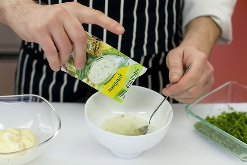 Sos Knorr połącz z 6 łyżkami wody i majonezem. Dodaj posiekaną pietruszkę.