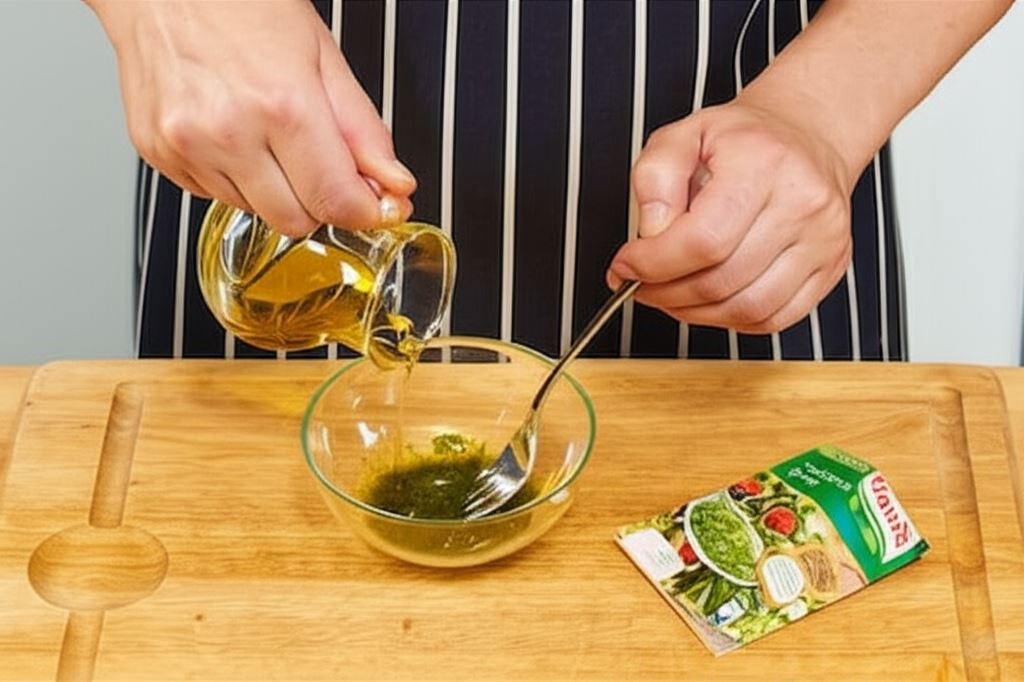 Podpraż orzechy na suchej patelni. Przygotuj dressing do sałatki mieszając Sos sałatkowy koperkowo-ziołowy Knorr z oliwą.
