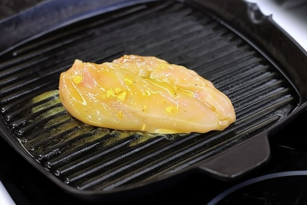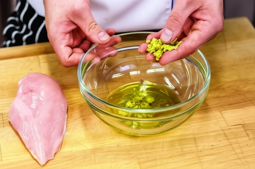 W miseczce wymieszaj kostkę rosołową z 3 łyżkami oliwy, a potem zamarynuj w uzyskanej paście piersi z kurczaka.