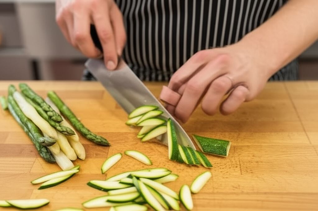 Szparagi oczyść (białe obierz) i odetnij stwardniałe końcówki. Potem blanszuj krótko w delikatnie osolonej wodzie z dodatkiem cukru. Cukinię przekrój wzdłużnie na 4 części, usuń nasiona i pokrój ukośnie na mniejsze kawałki.