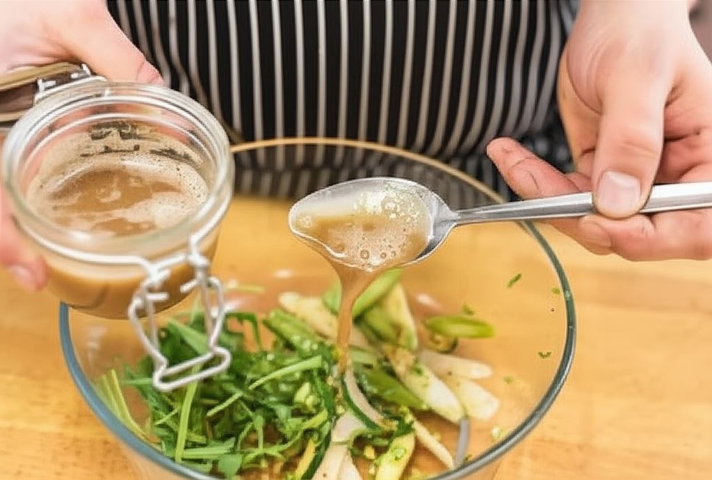 Sporządź dressing: do słoiczka wlej wodę, ocet, miód, oliwę i musztardę. Wsyp szczyptę soli oraz świeżo zmielonego pieprzu. Słoiczek dokładnie zamknij i energicznie wstrząsając połącz składniki sosu.