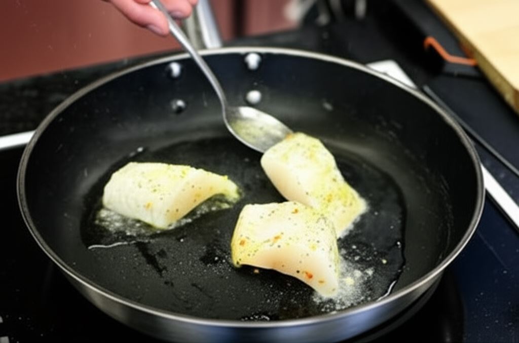 Podgrzej resztę oliwy na patelni i smaż rybę od strony ze skórą przez parę minut, aby uzyskać chrupkość.