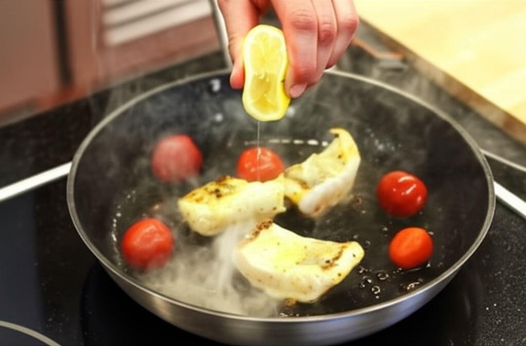 Potem obróć rybę na przeciwną stronę, wsyp całe pomidory i dodaj sok z cytryny. Smaż przez jeszcze minutę.