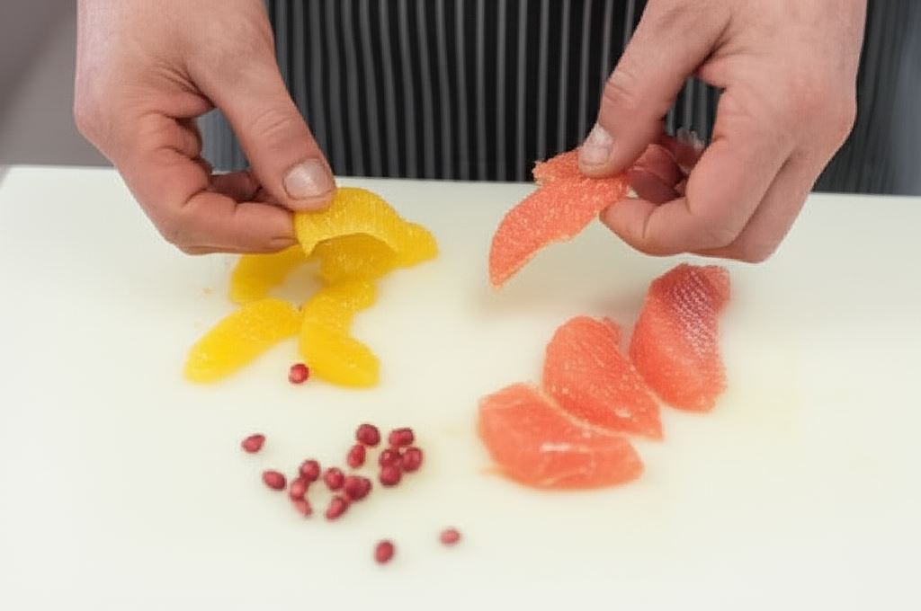 Obierz grejpfruta i pomarańczę ze skórki, po czym wytnij filety – segmenty. Obierz również granat i wydobądź z niego pestki.
