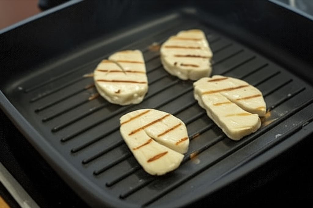 Halloumi to tradycyjny cypryjski ser wytwarzany głównie z mleka owczego. Charakteryzuje się twardą, a jednocześnie elastyczną konsystencją, która sprawia, że doskonale nadaje się do grillowania i smażenia. Jego delikatnie słonawy smak idealnie równoważy słodycz owoców w sałatce.