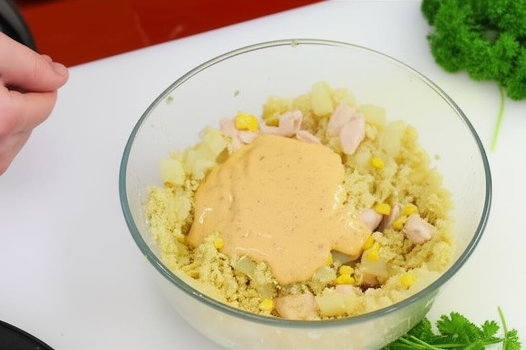 Delikatne kawałki indyka, słodki ananas i chrupiąca kukurydza na puszystym łożu z kuskusu – to połączenie, które zachwyci nawet najbardziej wymagających smakoszy! Nasza sałatka z indykiem na słodko to prawdziwa eksplozja smaków, gdzie słodycz ananasa idealnie komponuje się z delikatnym mięsem drobiowym, a wszystko dopełnia kremowy dressing na bazie majonezu i soku pomarańczowego.