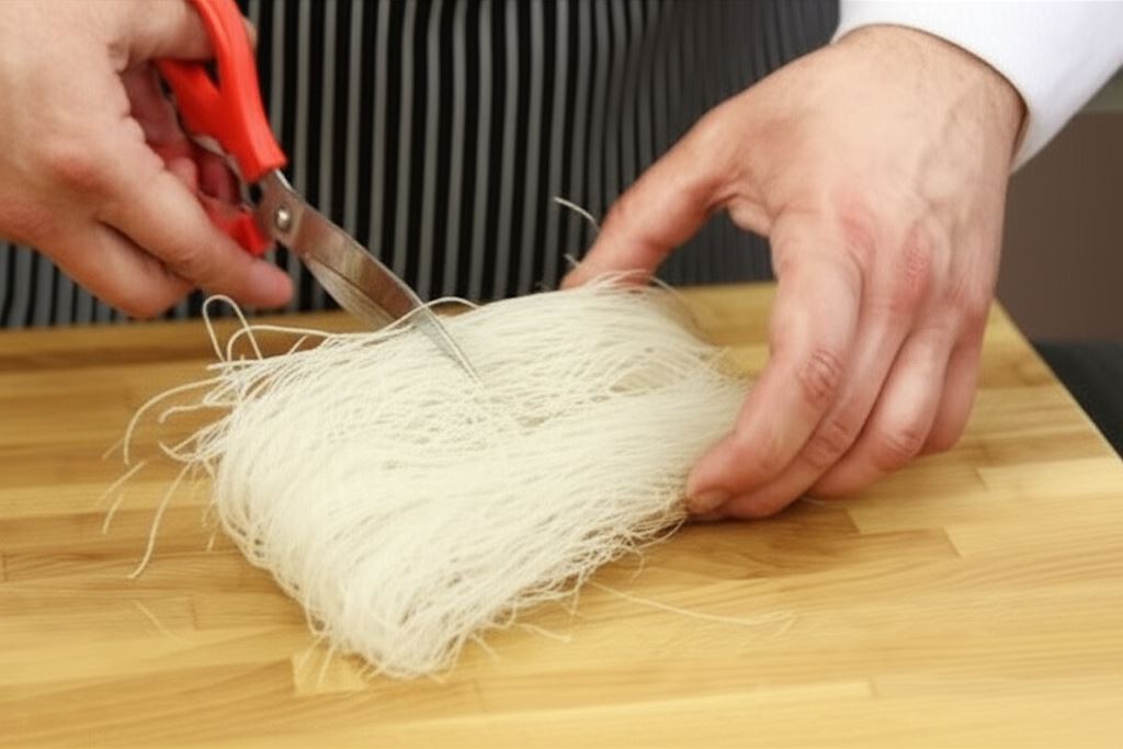 Makaron ryżowy potnij nożyczkami na mniejsze kawałki, zalej wrzącą wodą, gotuj przez 3-4 minuty. Przepłucz zimną wodą i odstaw na sicie, aby makaron obciekł.