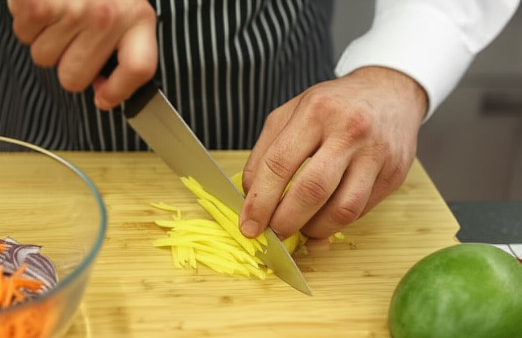 Marchew, cebulę i mango obierz i posiekaj w bardzo cienkie plastry, a potem w długie cieniutkie paseczki, wyglądające jak nitki (możesz do tego wykorzystać tarkę).