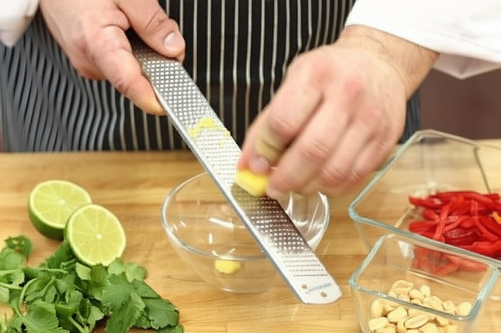 Posiekaj natkę kolendry. Paprykę przekrój na cztery części, wyciągnij gniazda nasienne i pokrój w bardzo cienkie paseczki, tak samo jak marchewkę, cebulę i mango. Obierz imbir, zetrzyj go na tarce. Orzechy rozdrobnij nożem na małe kawałki. Wyciśnij sok z limonki.
