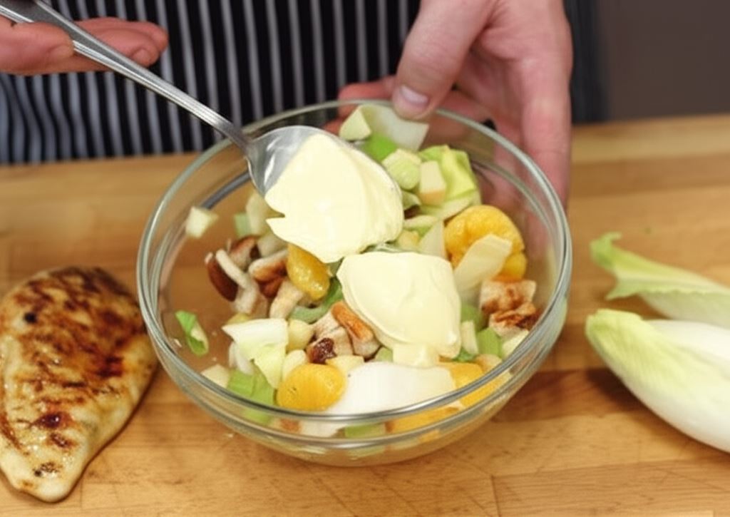 Selera naciowego potnij w kostkę, o podobnym rozmiarze jak kurczak. Blanszuj 30 sekund we wrzącej wodzie, potem wystudź w dużym naczyniu i wymieszaj z kurczakiem. Wsyp odsączone mandarynki, pokrojony w kostkę żółty ser, fragmenty cykorii oraz zrumienione na patelni migdały.