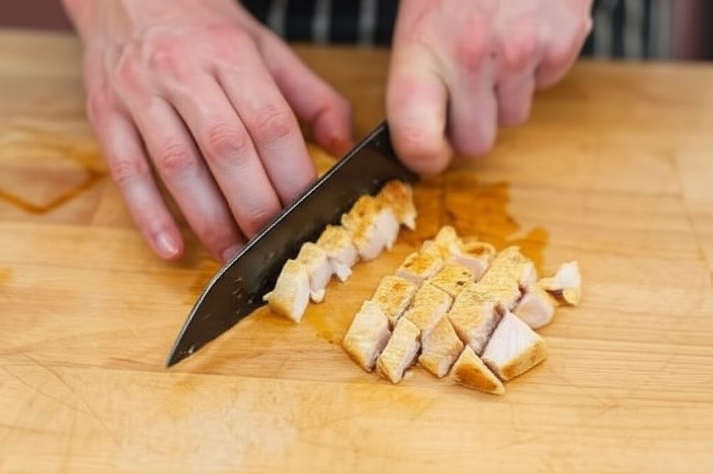 Kurczaka posyp przyprawą Knorr, przysmaż na patelni. Poczekaj aż wystygnie, a potem pokrój w kostkę.