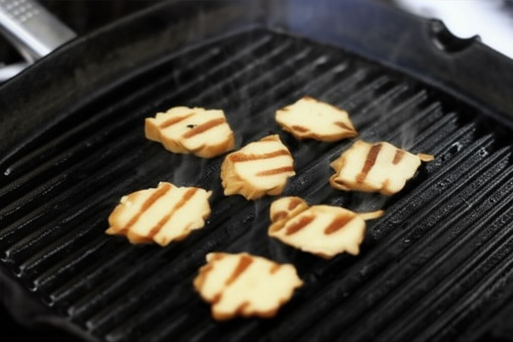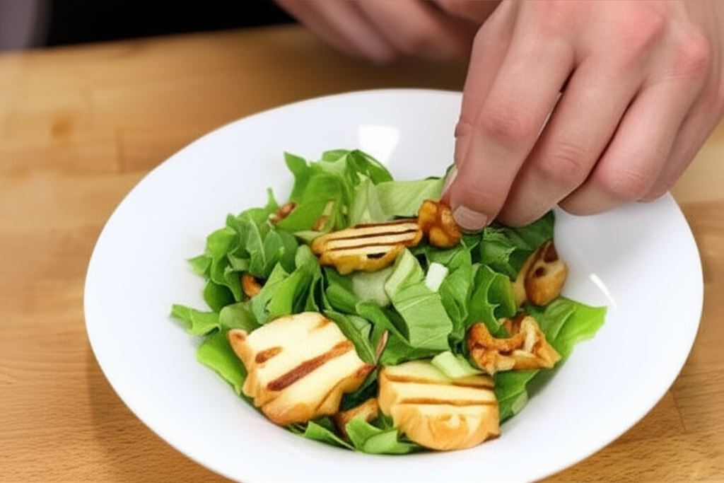 Rozdziel liście sałaty i podziel na mniejsze części. Ser pokrój w plastry i przysmaż na patelni grillowej z obu stron.