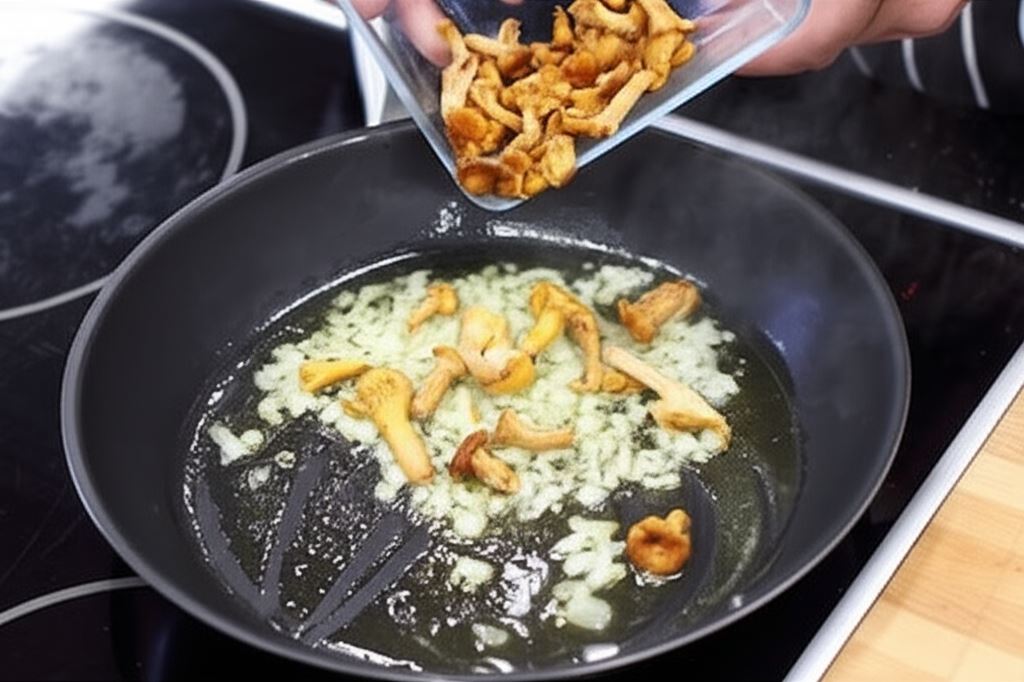 Cebulę posiekaj w małą kostkę, przesmaż na gorącym tłuszczu, po czym wsyp kurki i smaż przez moment wspólnie.