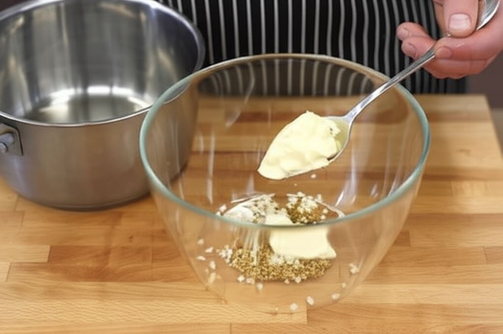 W rondelku połącz ocet z cukrem. Mieszankę delikatnie podgrzej aż cukier całkowicie się rozpuści. Potem dodaj musztardę, posiekany czosnek i majonez. Wszystko starannie wymieszaj.