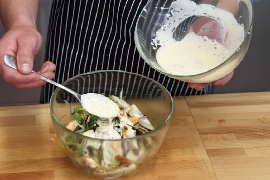 Połącz wszystkie składniki z dresingiem i umieść w miseczce.