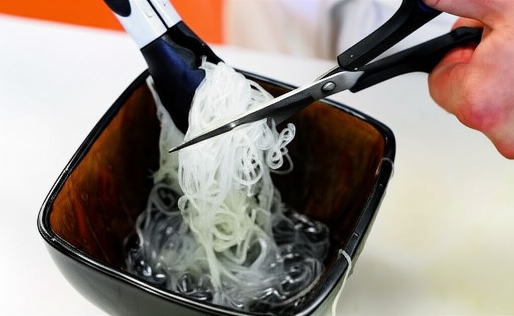 Makaron zalej letnią wodą i odstaw do zmięknięcia. Po upływie tego czasu odcedź go i pokrój, na przykład nożyczkami, na krótsze kawałki.