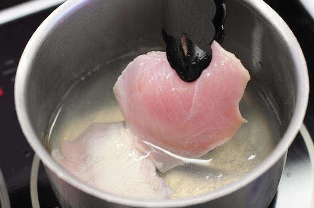Ugotuj piersi kurczaka w wodzie aż będą miękkie. Potem ostudź.