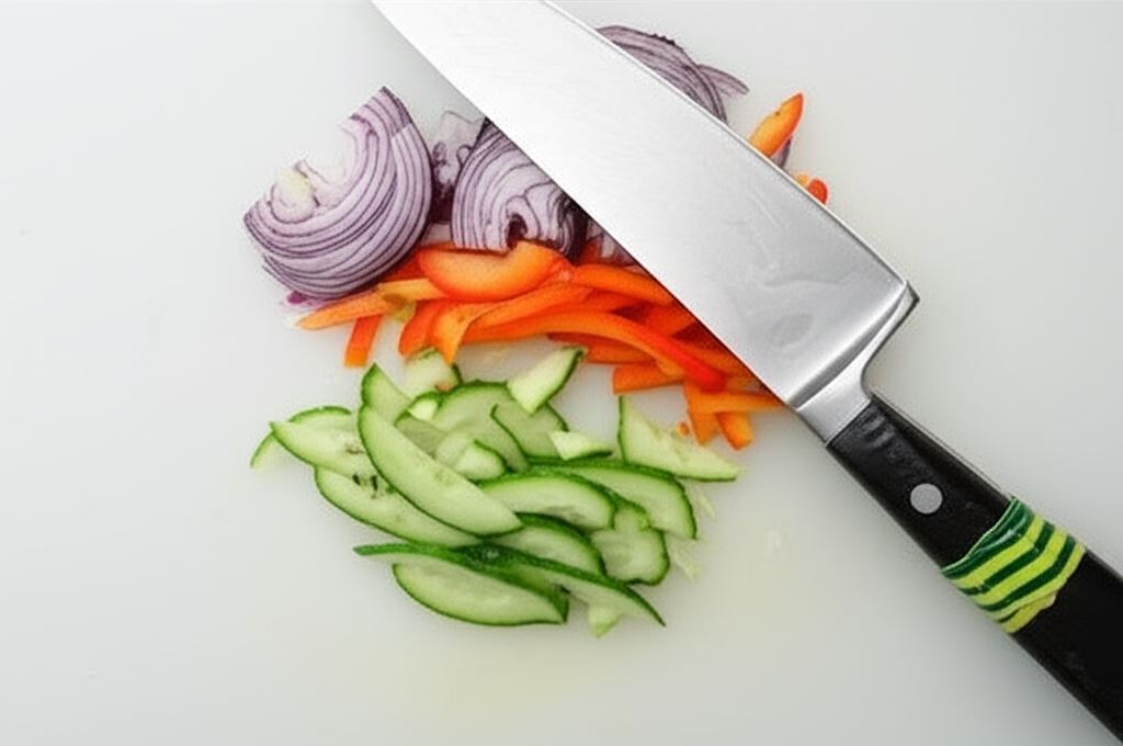 Cebulę, oczyszczoną paprykę, ogórka oraz mięso pokrój na cienkie paseczki.