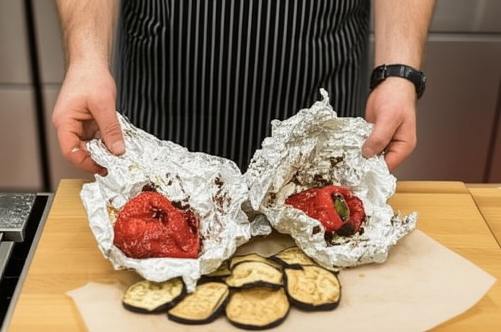 Paprykę owiń w folię aluminiową, również umieść razem z bakłażanami w piekarniku, piecz jednakże trochę dłużej, około 30 minut, po czym także odstaw je w folii do ostygnięcia. Następnie zdejmij skórkę, wyciągnij nasiona i pokrój w duże kawałki dowolnego kształtu.