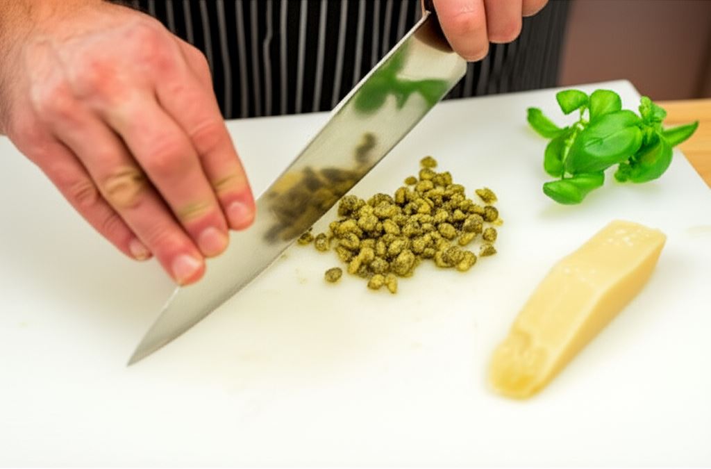 Posiekaj kapary niezbyt drobno, potnij bazylię i parmezan na cienkie płatki.