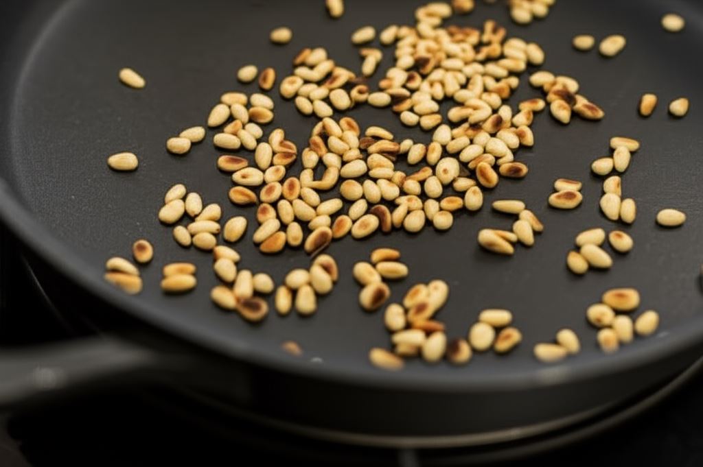Sałatkę przenieś na duży półmisek i przystrój wiórkami parmezanu i orzeszkami pinii.