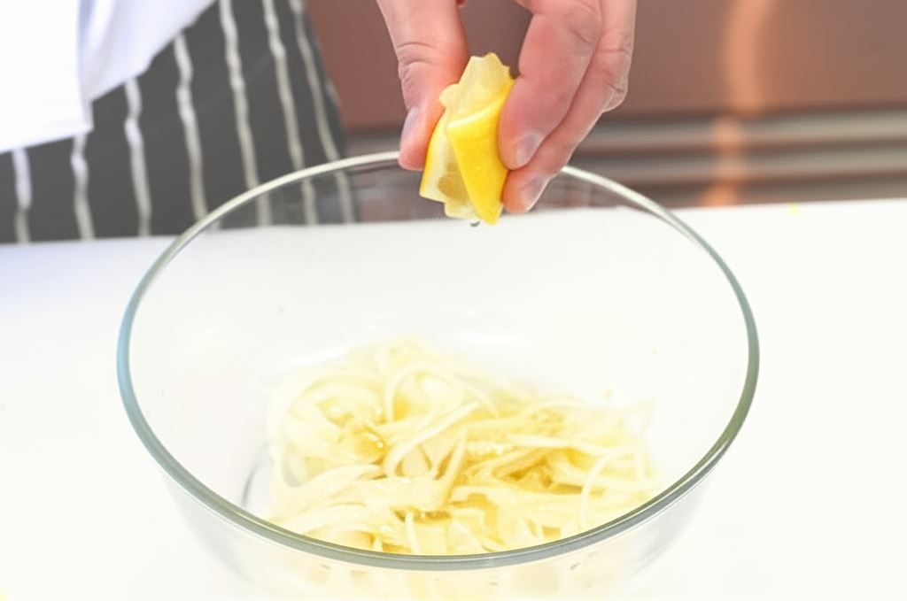 Z koperku, natki pietruszki, musztardowca i kolendry oderwij jedynie listki. Umieść w miseczce. Z fennela usuń zewnętrzną warstwę. Potem pokrój bulwę na krajalnicy w bardzo cienkie plastry. Kilka początkowych z łodygą warzywa w środku wyrzuć. Fennela polej miodem, niewielką ilością oliwy oraz skrop sporą ilością soku z cytryny.
