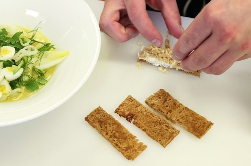 W głęboki talerz wlej aromatyczny bulion z drobiu, umieść fennela, potem listki ziół i połówki jajek. Skrop sałatkę od góry oliwą tymiankową i serwuj z grzanką.