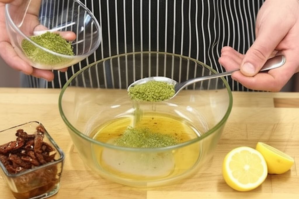 Sporządź sos – zawartość opakowania Knorr wymieszaj z sokiem cytrynowym i oliwą z pomidorów suszonych.