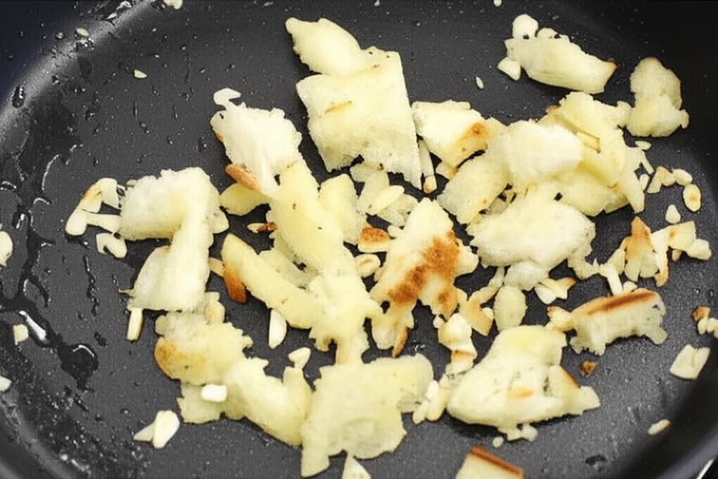 Pieczywo podrzyj na drobniejsze kawałki, czosnek posiekaj. Na patelni podgrzej oliwę, zeszklij posiekany czosnek, po czym dodaj kawałki pieczywa i przyrumień je na złoty kolor.