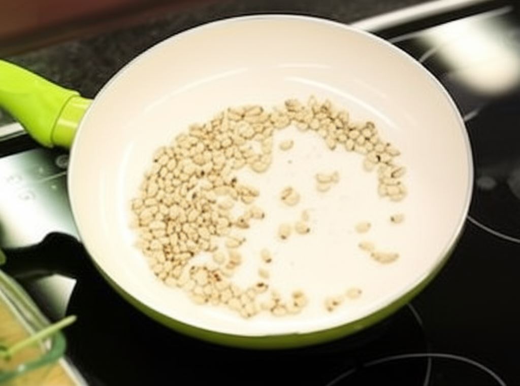 Prażyj orzeszki na suchej, nagrzanej patelni. Rukolę opłucz i wysusz.