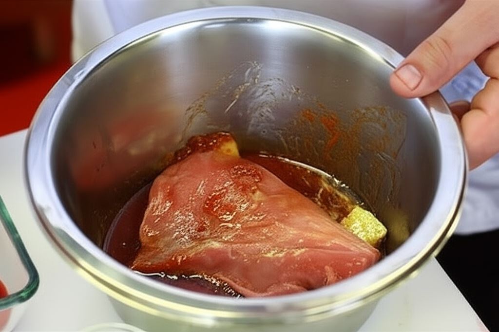 Potnij cielęcinę na cienkie plastry. Potem połącz składniki marynaty i zanurz w niej cielęcinę.