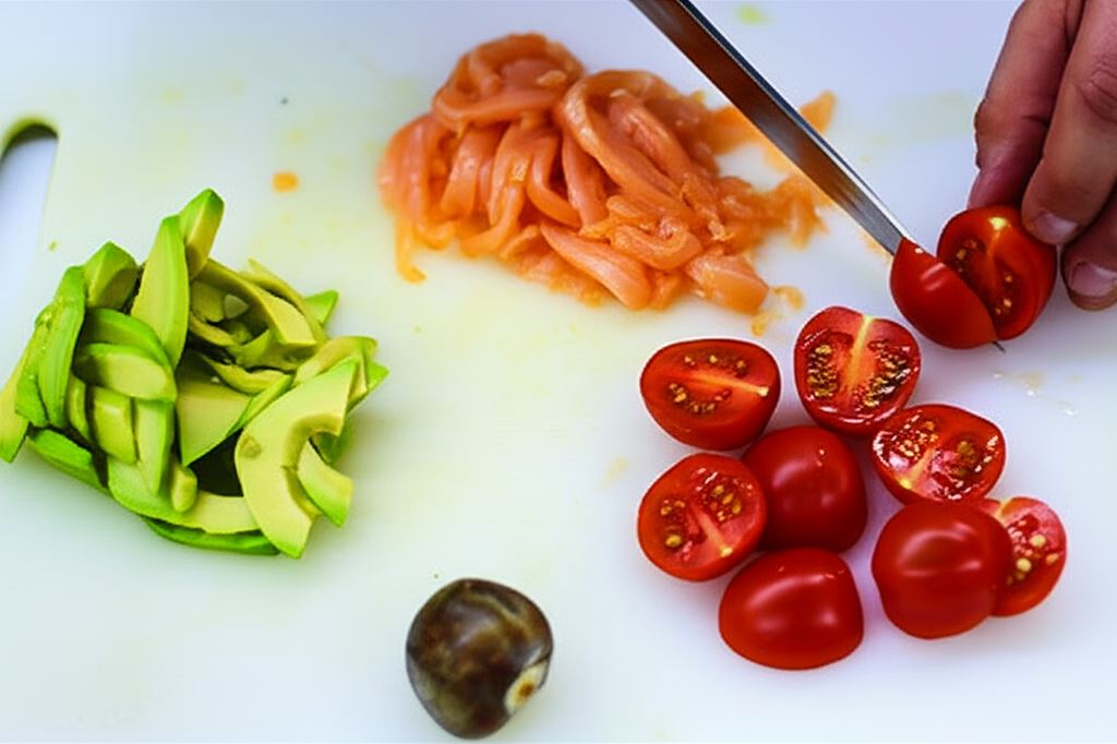 Łososia potnij w paski, pomidorki przekrój na połówki.
