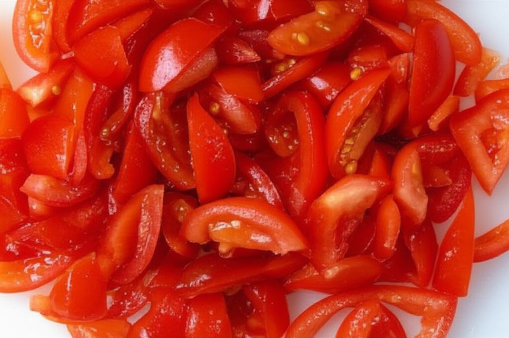 Pomidory przekrój na ćwiartki, wydrąż z nich gniazda nasienne, po czym pokrój w paski.