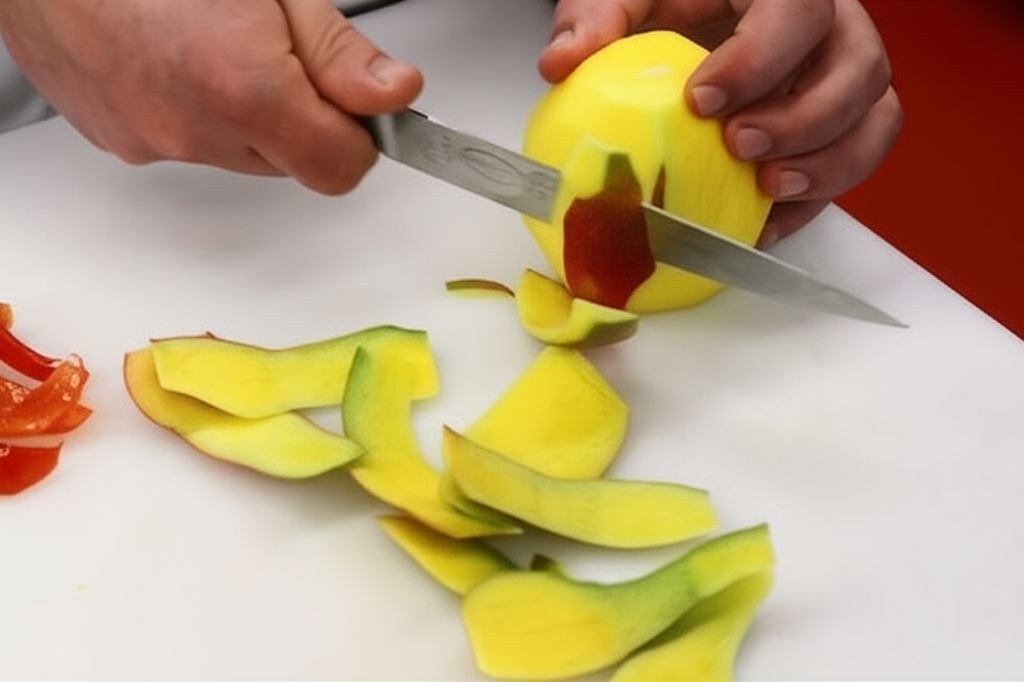 Mango obierz, potnij na plastry, następnie pokrój w paski.