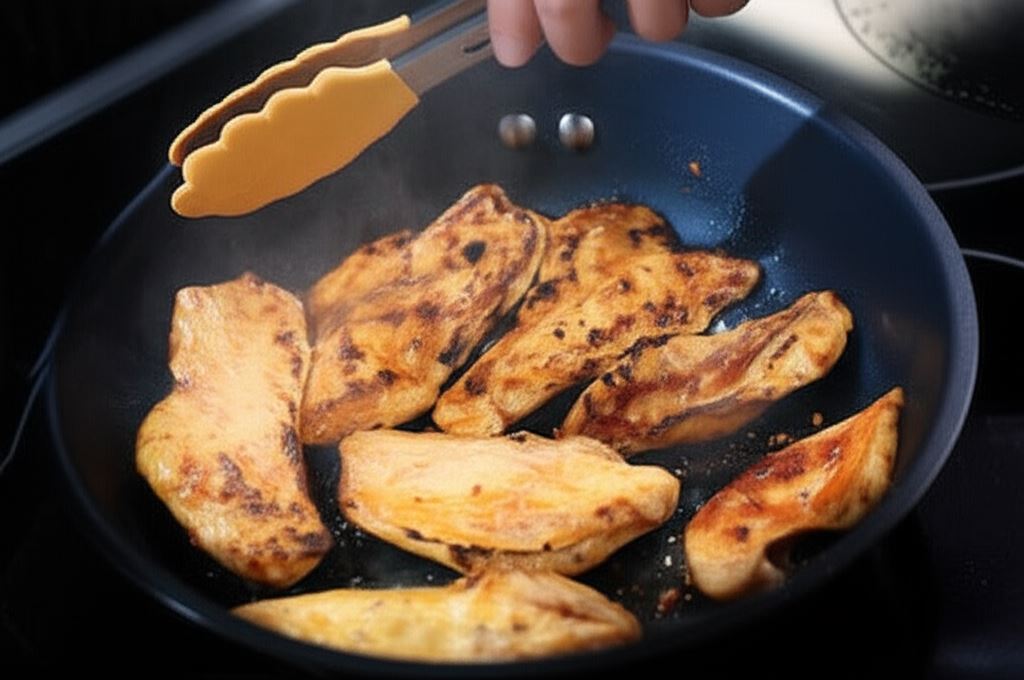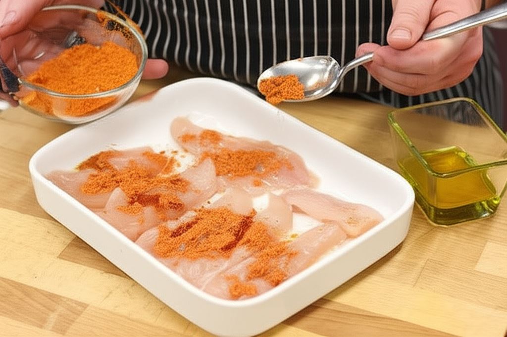 Kurczaka pierś podziel na plastry i umieść w misce, polej olejem i posyp hojnie przyprawą Knorr. Pozostaw na parę godzin w lodówce.