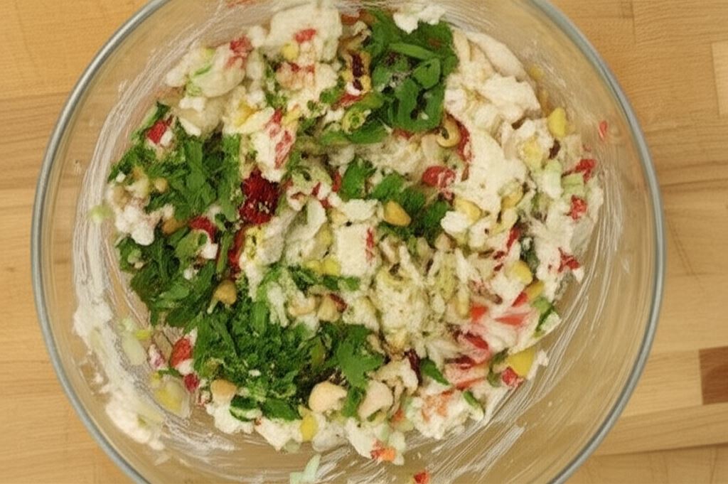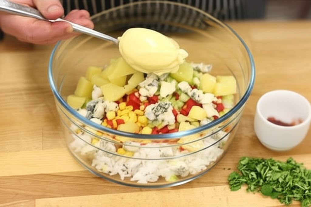 W misce wymieszaj razem wszystkie składniki, dodaj majonez, całość dopraw do smaku przyprawą Chili z Indii Knorr.