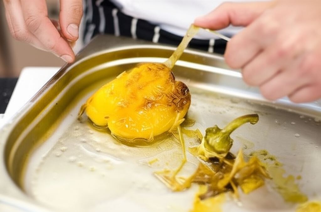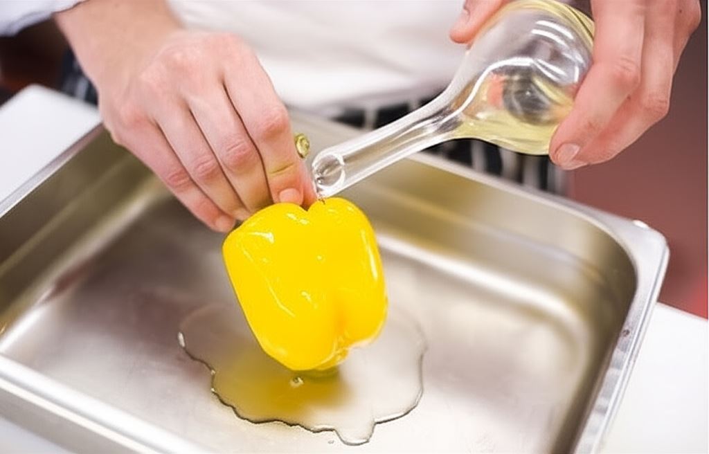 Po wypieczeniu gorącą paprykę umieść w misce i przykryj dokładnie folią spożywczą, by papryka się zaparowała. Odczekaj do ostygnięcia, usuń skórkę i wyciągnij pestki.
