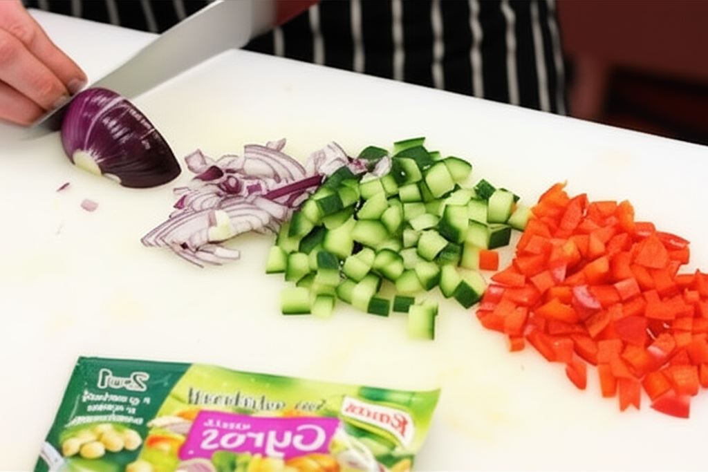 Paprykę, cebulę i ogórki posiekaj w małą kostkę. Kolendrę drobno pokrój.
