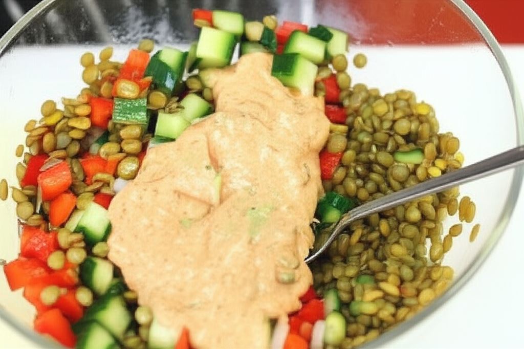 Odkryj naszą aromatyczną sałatkę z soczewicą – danie, które zachwyca prostotą przygotowania i bogactwem smaków! Soczysta czerwona papryka, chrupiący ogórek i delikatna soczewica tworzą harmonijne połączenie, które zostaje dopełnione kremowym sosem na bazie jogurtu i ketchupu. Całość zyskuje wyrazisty charakter dzięki dodatkowi soku z cytryny i pieprzu cayenne, a posypana świeżą kolendrą i chrupkimi grzankami staje się prawdziwą ucztą dla podniebienia.