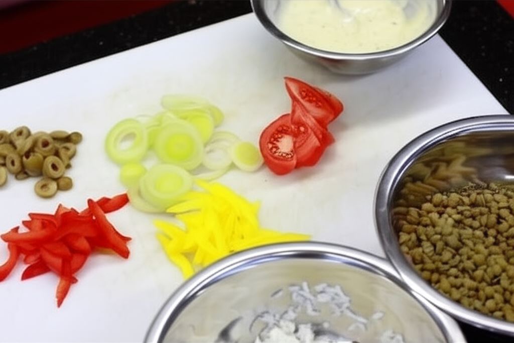 Dokładnie oczyść pora, przepłucz i potnij w krążki. Przepłucz papryki, usuń pestki i potnij w krótkie paski. Przepłucz również pomidory, potnij je na cząstki, a oliwki - w krążki lub na kawałki.