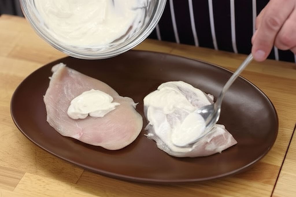 Pierś kurczaka przekrój wzdłuż na połowę. Majonez połącz z przeciśniętym czosnkiem, sokiem z cytryny i posmaruj mięso. Odstaw na 10 minut, by mięso się zamarynowało.