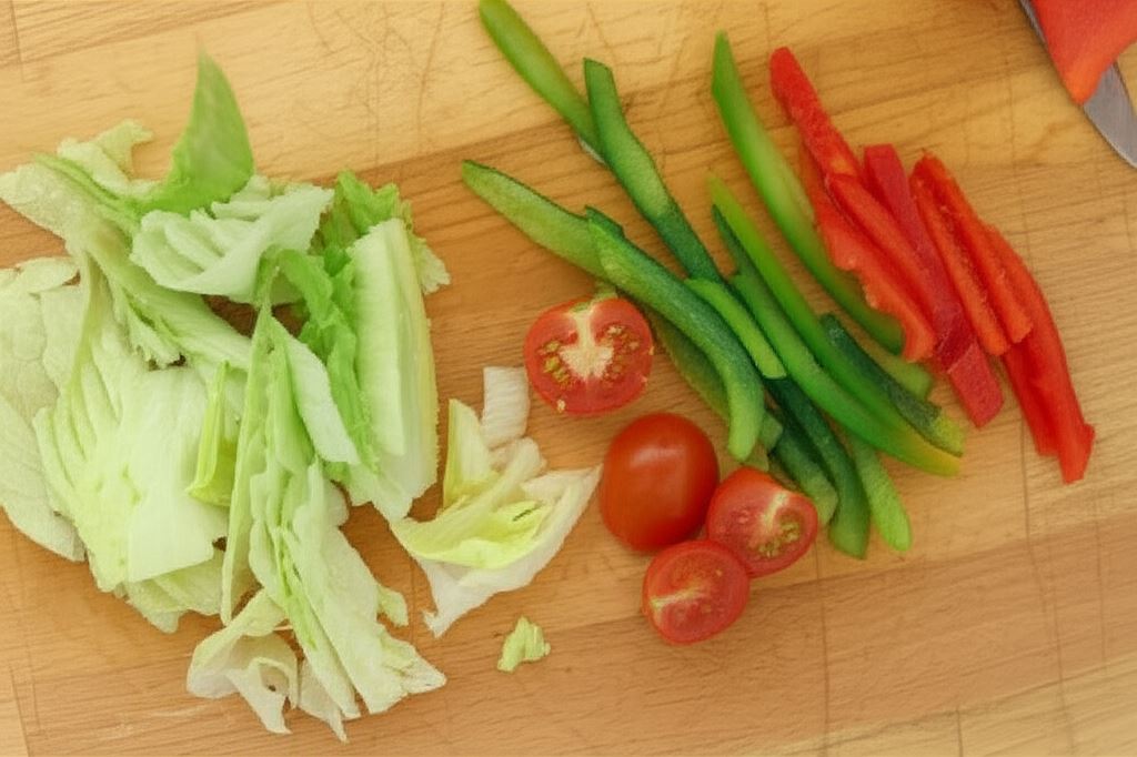 Sałatę lodową podrzyj na drobniejsze części, pomidorki przetnij na połówki, a paprykę i cebulę w paski. Wszystkie warzywa umieść w misce.