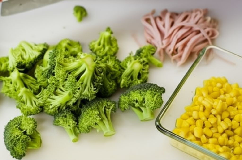 Brokuł podziel na różyczki, szynkę potnij w paski, kukurydzę odcedź.