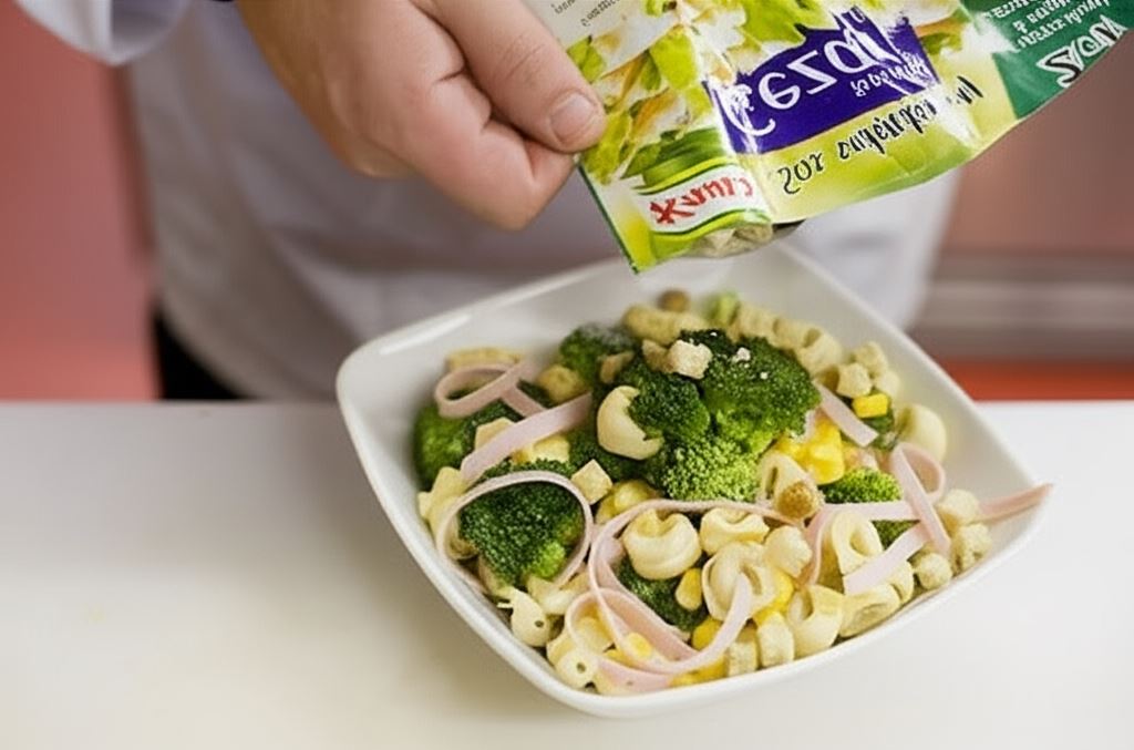 Wyobraź sobie harmonię smaków, gdzie włoskie tortellini spotykają się z chrupiącymi brokułami i soczystą szynką. Ta kolorowa kompozycja to prawdziwa uczta nie tylko dla podniebienia, ale i dla oczu! Delikatne pierożki tortellini, ugotowane al dente i schłodzone, stanowią doskonałą bazę dla pozostałych składników. Soczyste różyczki brokuła, paski aromatycznej szynki i słodka kukurydza tworzą harmonijną całość, a wszystko to połączone kremowym sosem z mieszanki Knorr, majonezu i startego sera.