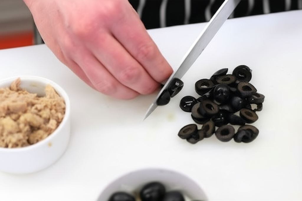 Oliwki potnij na cienkie plasterki, a tuńczyka odcedź od zalewy.